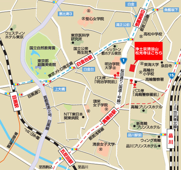 | JR山手線「品川駅」 高輪口を出て都営バス「目黒行」に乗車「高輪警察署前」下車。徒歩約1分。 |